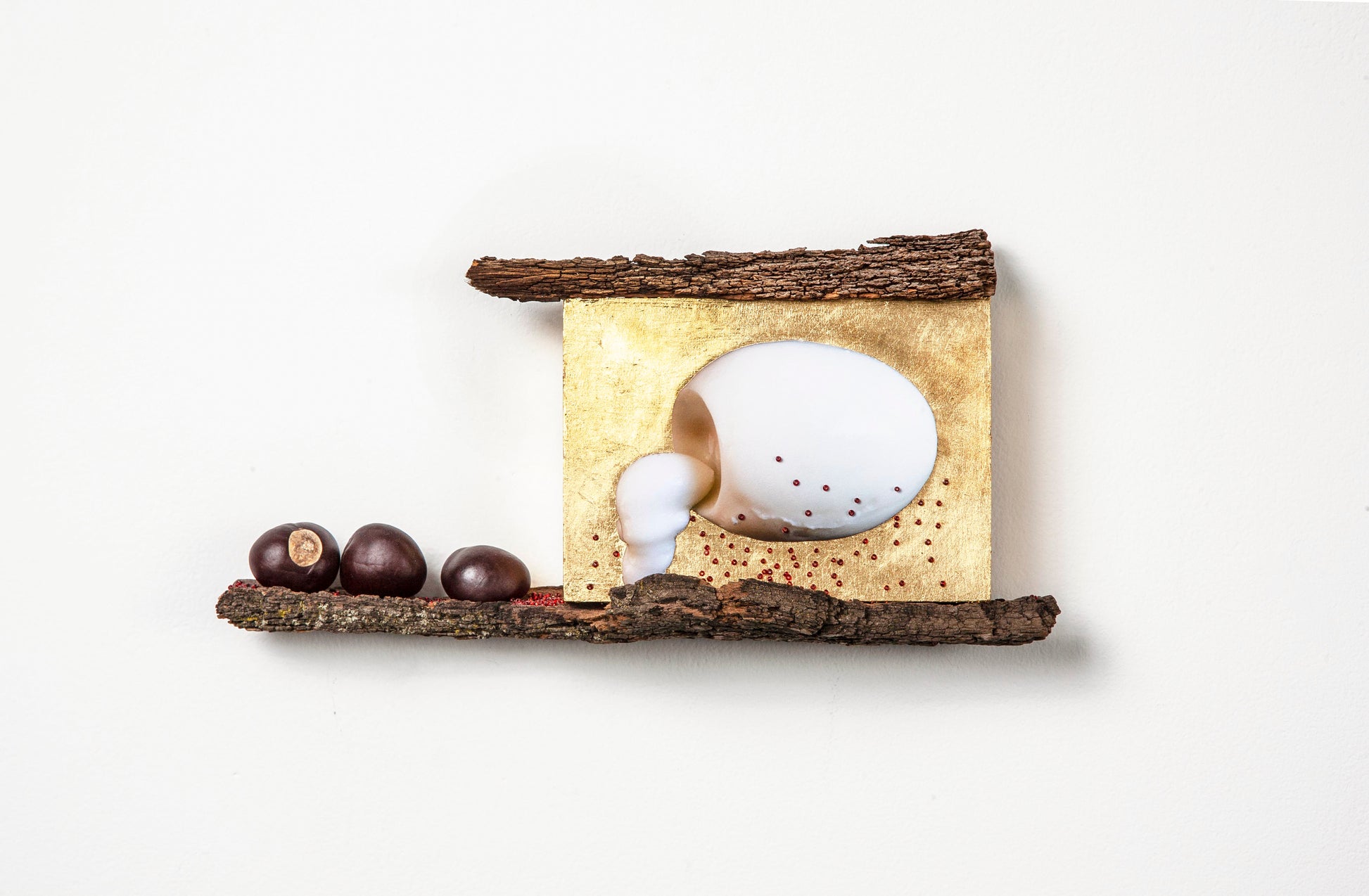 Archival pigment print, glass beads, found wood, horse chestnuts, metal leaf, on board