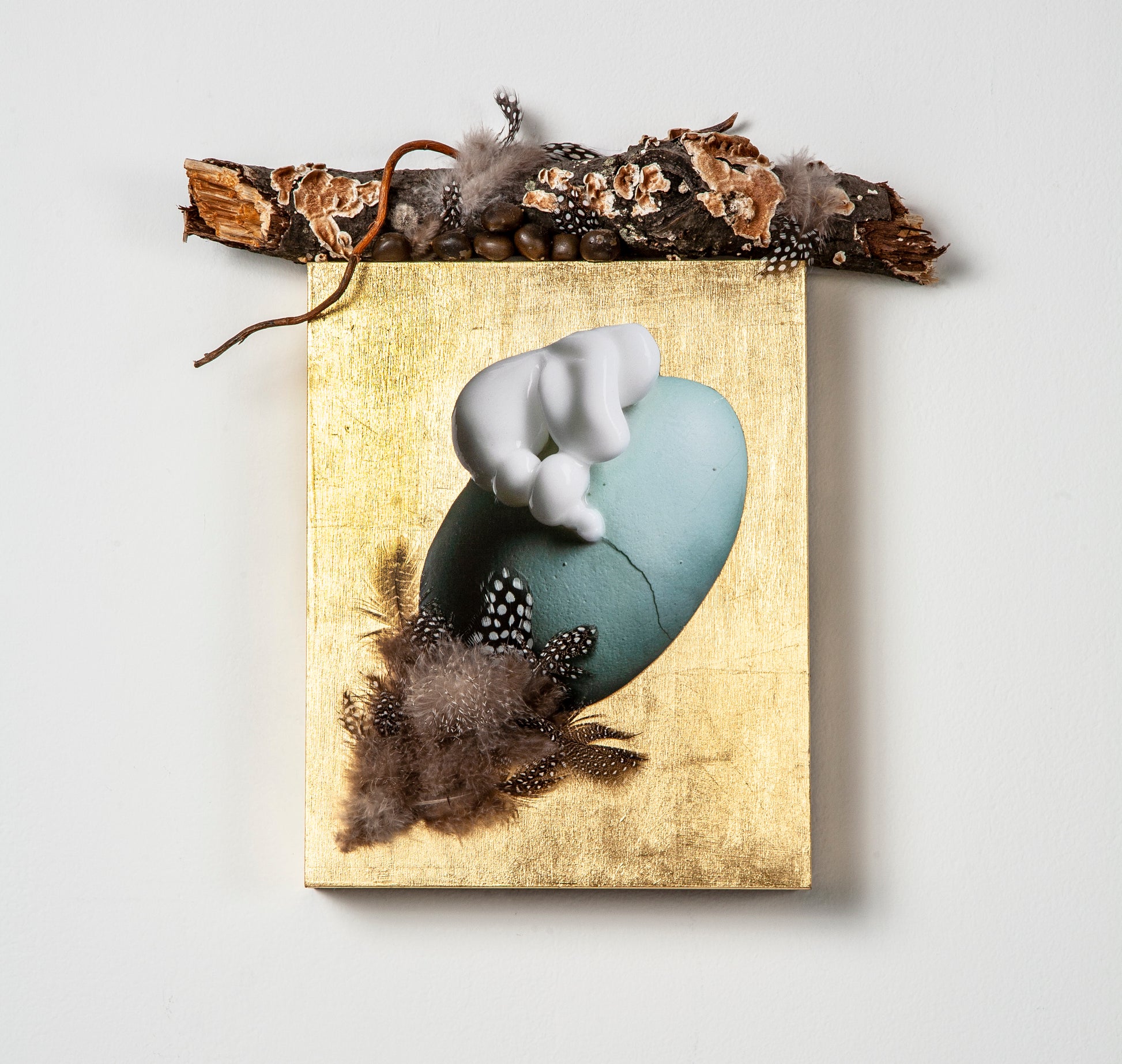 Archival pigment print, feathers, seeds, found wood, metal leaf, on board