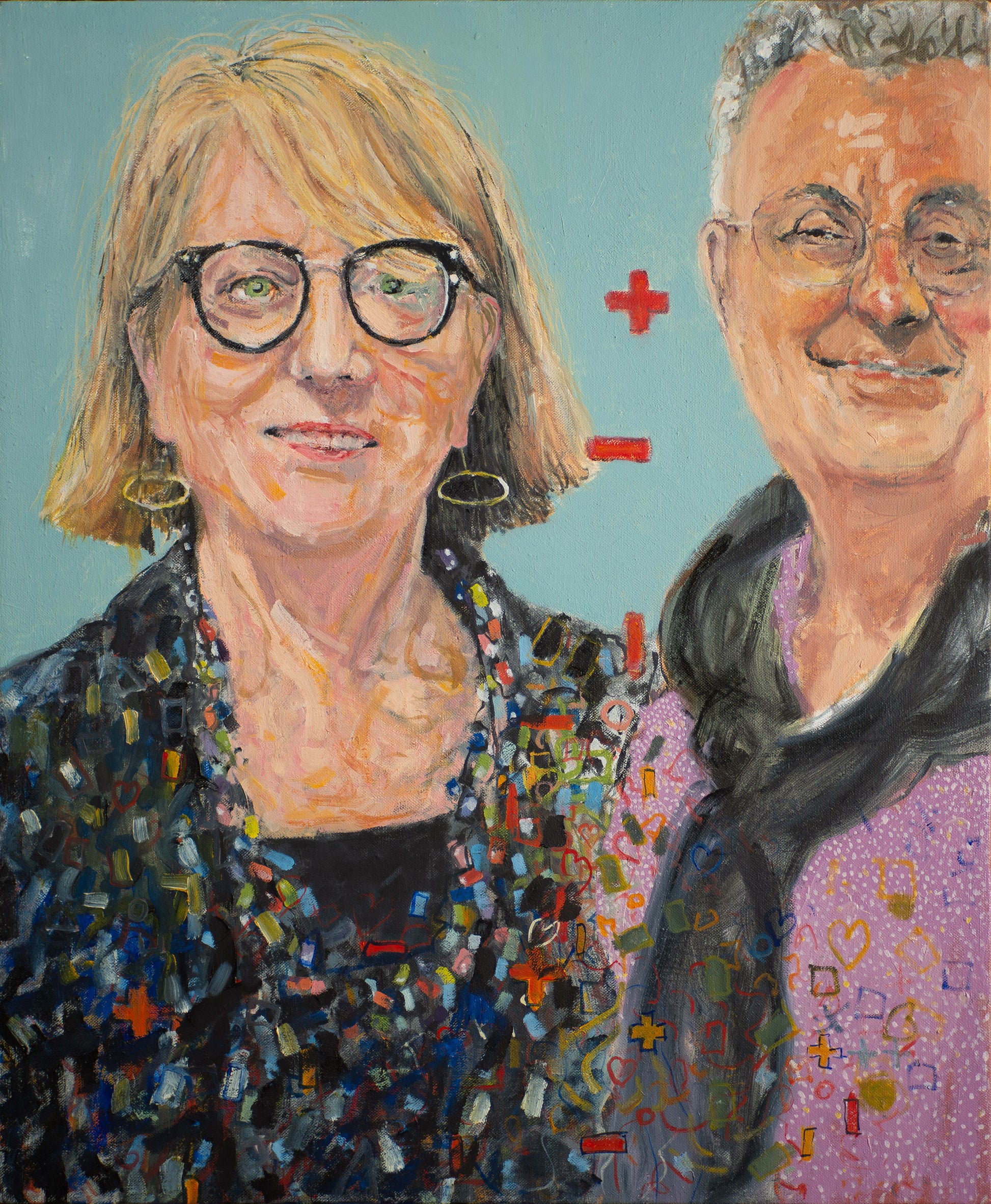 The painting captures that moment during an opening, when you realize it's a success, and you've finally been able to share your creation with the community, when your spouse stands proud. The painting is simple, just the two of them, but it also incorporates some of the symbols that Kim uses in her art.