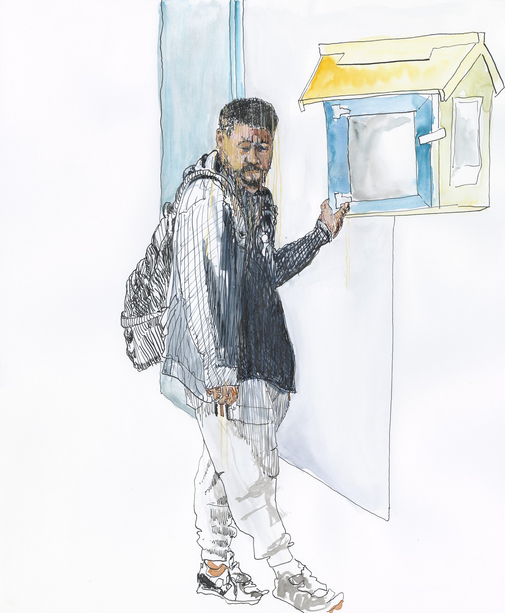 In front of the CHiPS soup kitchen is one of those little libraries, and this one happens to be shaped like a house. This person was waiting in the line for food and leaning on the house and I thought it was more than a little ironic that he could lean on this little house but probably not afford to live in one.
