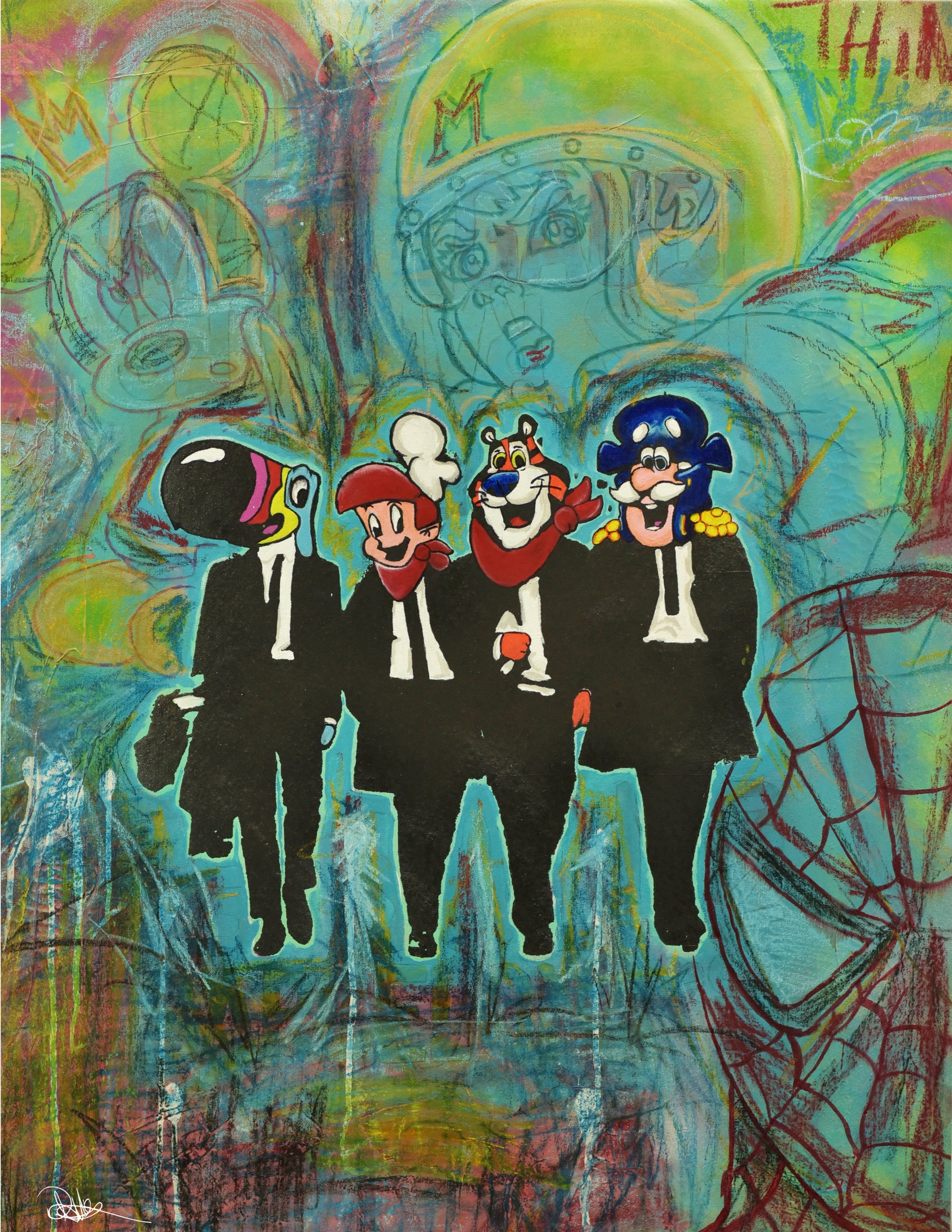 The Breakfast Club was created in 2019, during my residency in Barcelona, Spain. This mixed media painting was inspired by my thoughts from my inner child. I thought about eating breakfast and Saturday Morning Cartoons and how joyful I felt. The weekends were a time to have fun and be free. If you look deeper, this pop art piece is an intimate look into my adult life. Each character represents myself and my best friends. It explores our experiences together. It's about authentic connections, trusting friendships and vulnerable bonds.