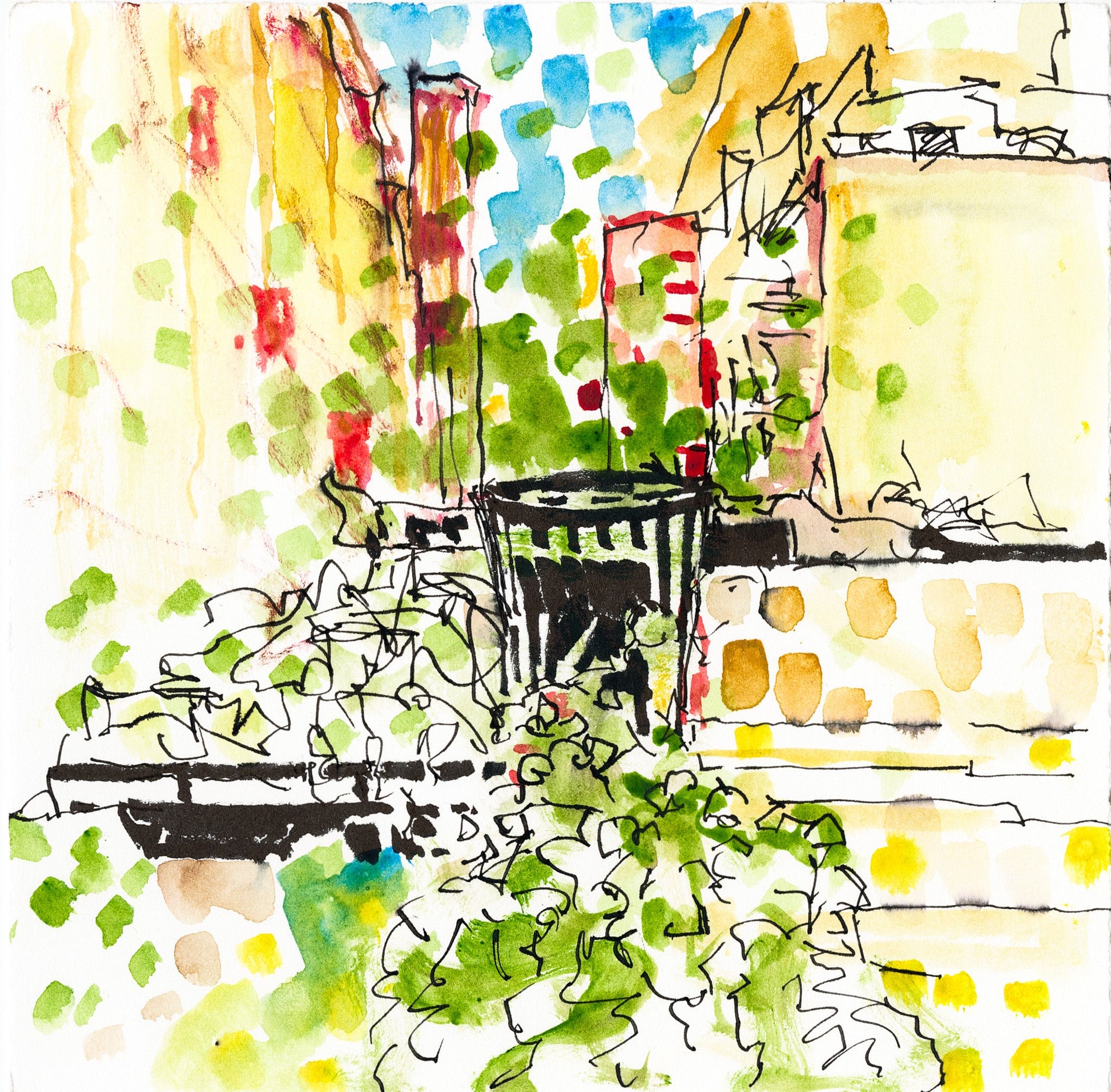 The drawing became about that meeting point—leaves pressing forward against the weight of new walls. A fragile green persistence, set against the hard geometry of the build.
